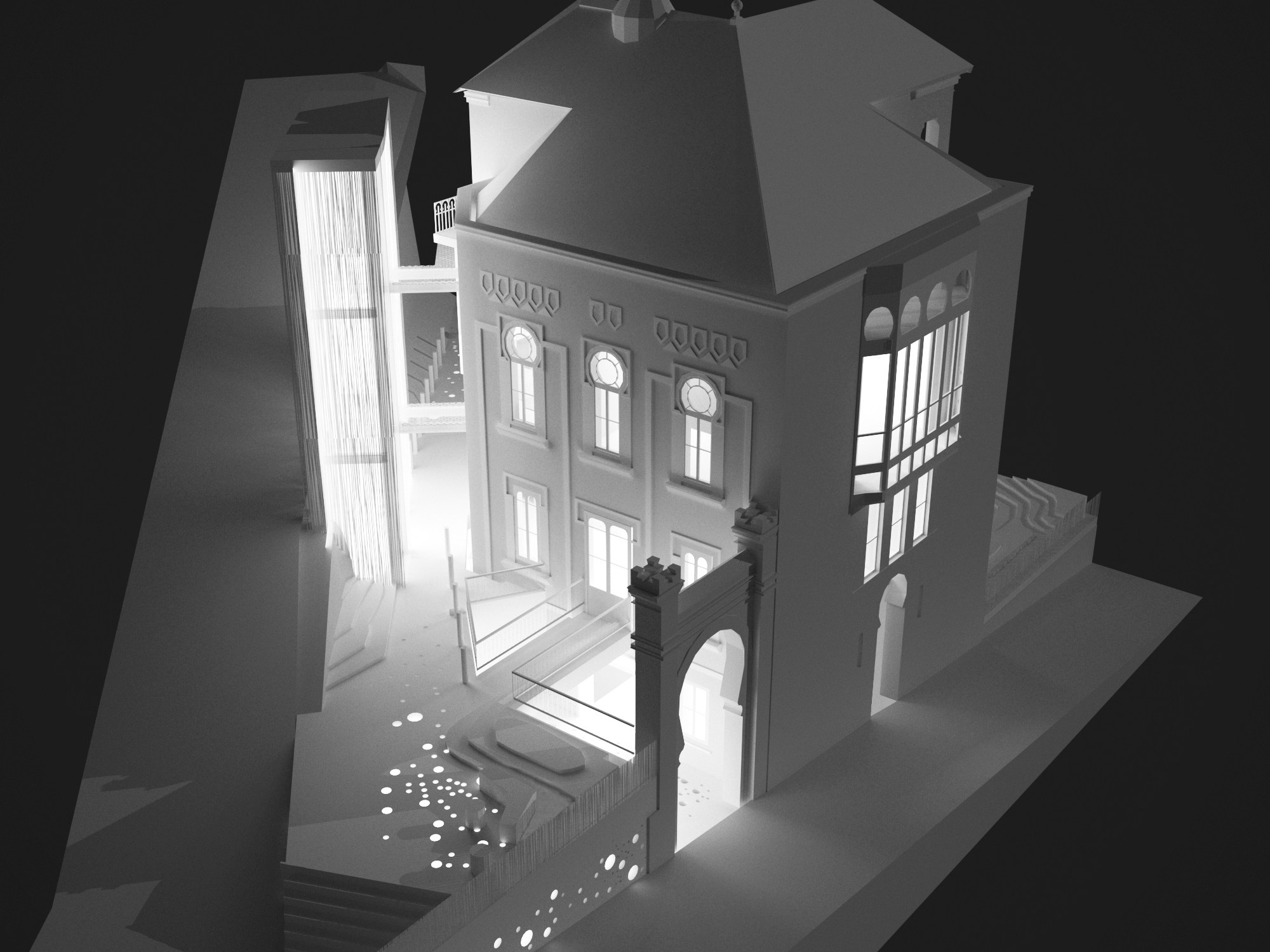- Separado en un volumen independiente y conectado por pasarelas: Es la solución que se ha adoptado, ya que de esta manera no se interviene en la estructura portante del palacio que queda liberado de un volumen demasiado grande para las dimensiones de sus salas. La fachada apenas se ve afectada, ya que la entrada se realiza por los huecos ya existentes modificando tan solo el peto inferior. El ascensor se erige como un tercer mirador, una nueva torre de luz envuelta en celosías del siglo XXI que dialoga con las otras torres mirador del s.XIX situadas en las fachadas sur y este y que a su vez conecta de forma accesible todos los niveles del edificio.