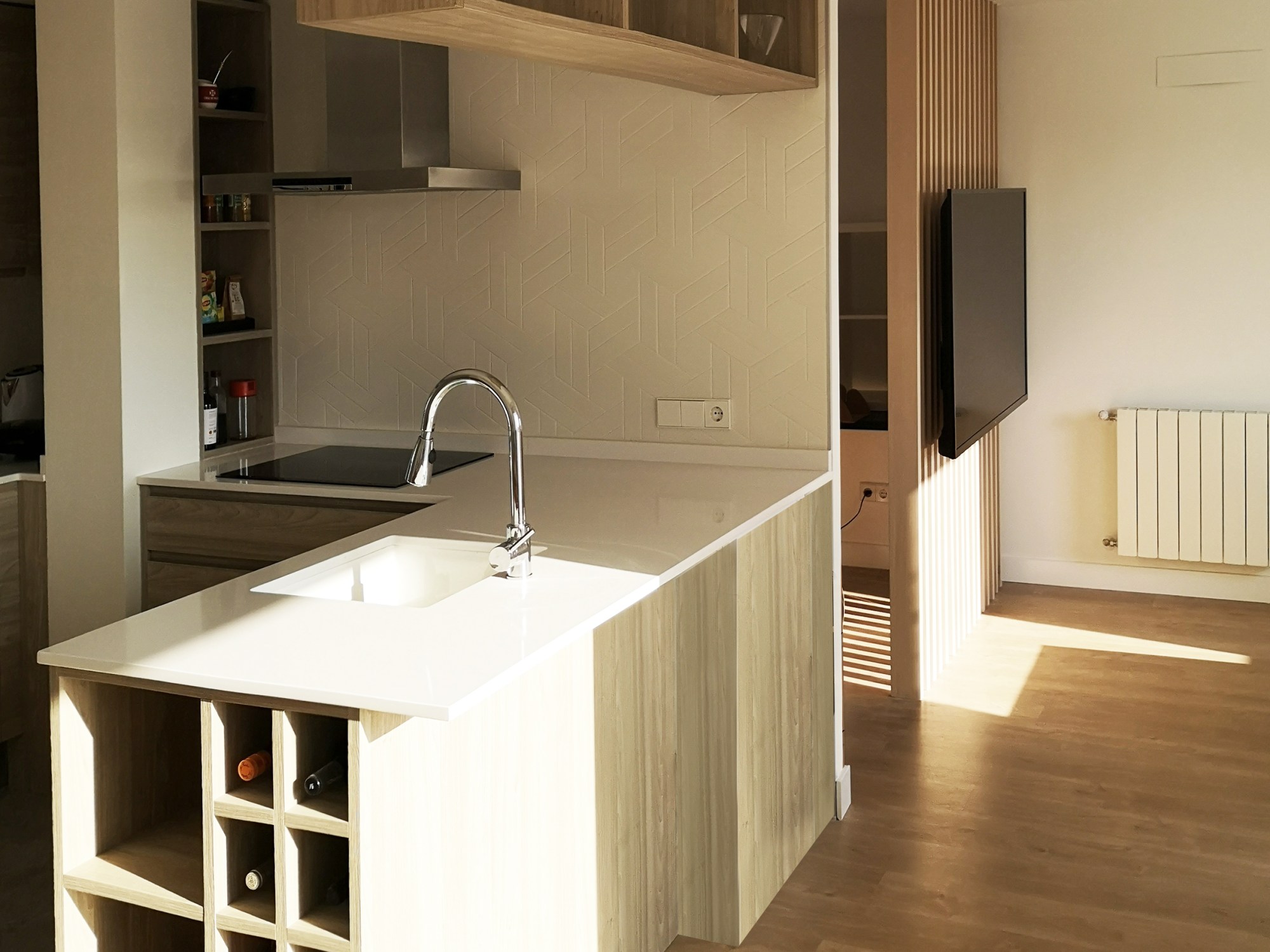 Este concepto de «espacio continuo» contiene distintos tipos de separaciones entre los ambientes. En el caso de despacho-salón, se trata de un paramento de lamas verticales de madera que además ejerce como soporte de la televisión. En el caso de cocina-salón, se trata de una isla con una estantería permeable en la parte superior.